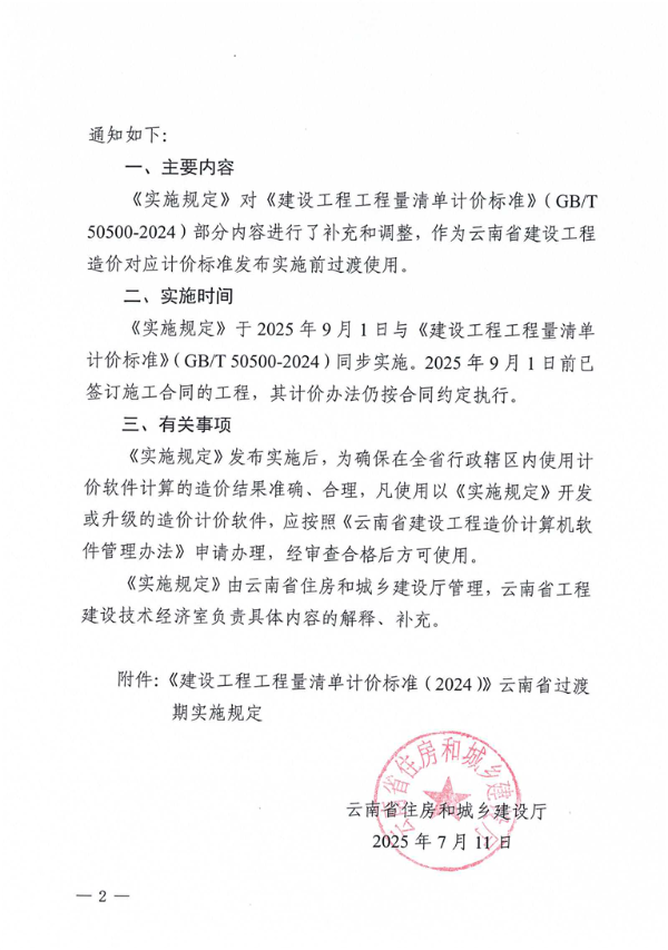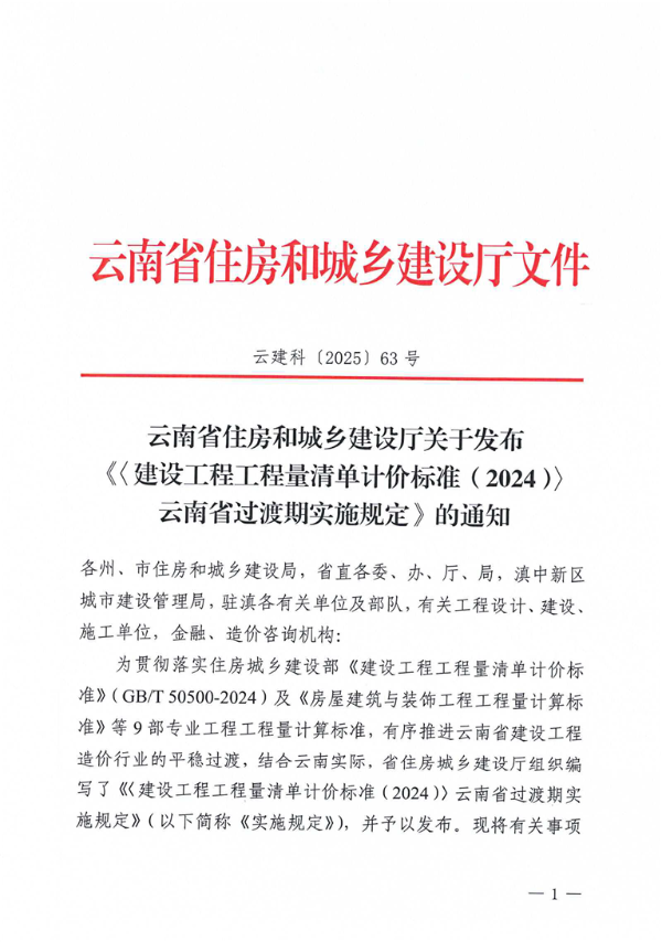 云南省任房和城乡建设厅关于发在布《〈建设工程工程量清单计价标准(2024) 云南省过渡期实施规定》的通知》